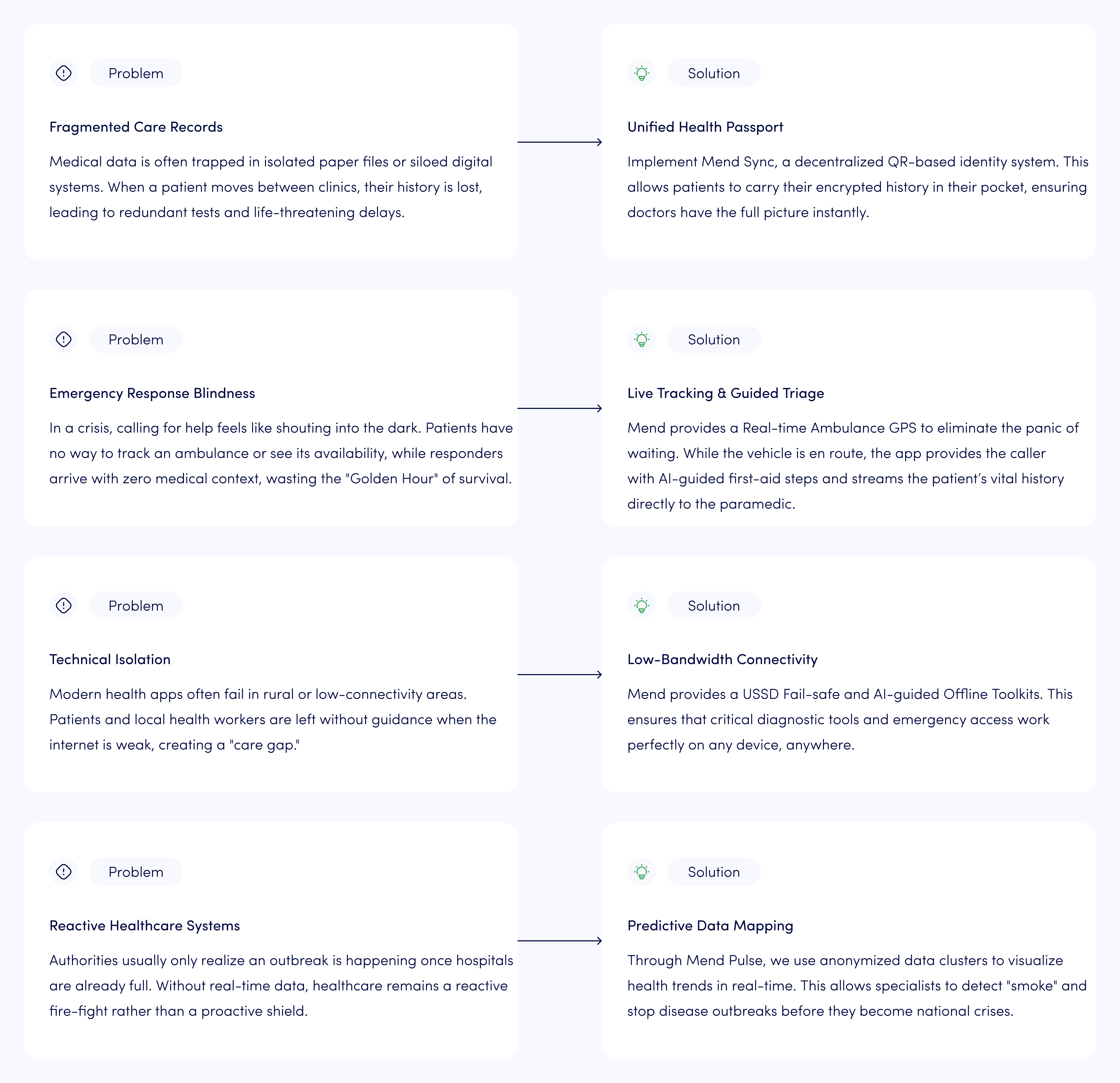To solve the critical failures in emergency communication and data continuity, Mend Thread Care provides an integrated ecosystem of three specialized products: Sync, Bridge, and Pulse. [ Mend Sync (The Citizen Product), Mend Bridge (The Agents, Medics, and Drivers), Mend Pulse (The Clinical, Admin Product, and Government) ]. Together, they unify the fragmented medical journey into a single, resilient digital thread that saves lives through real-time coordination.